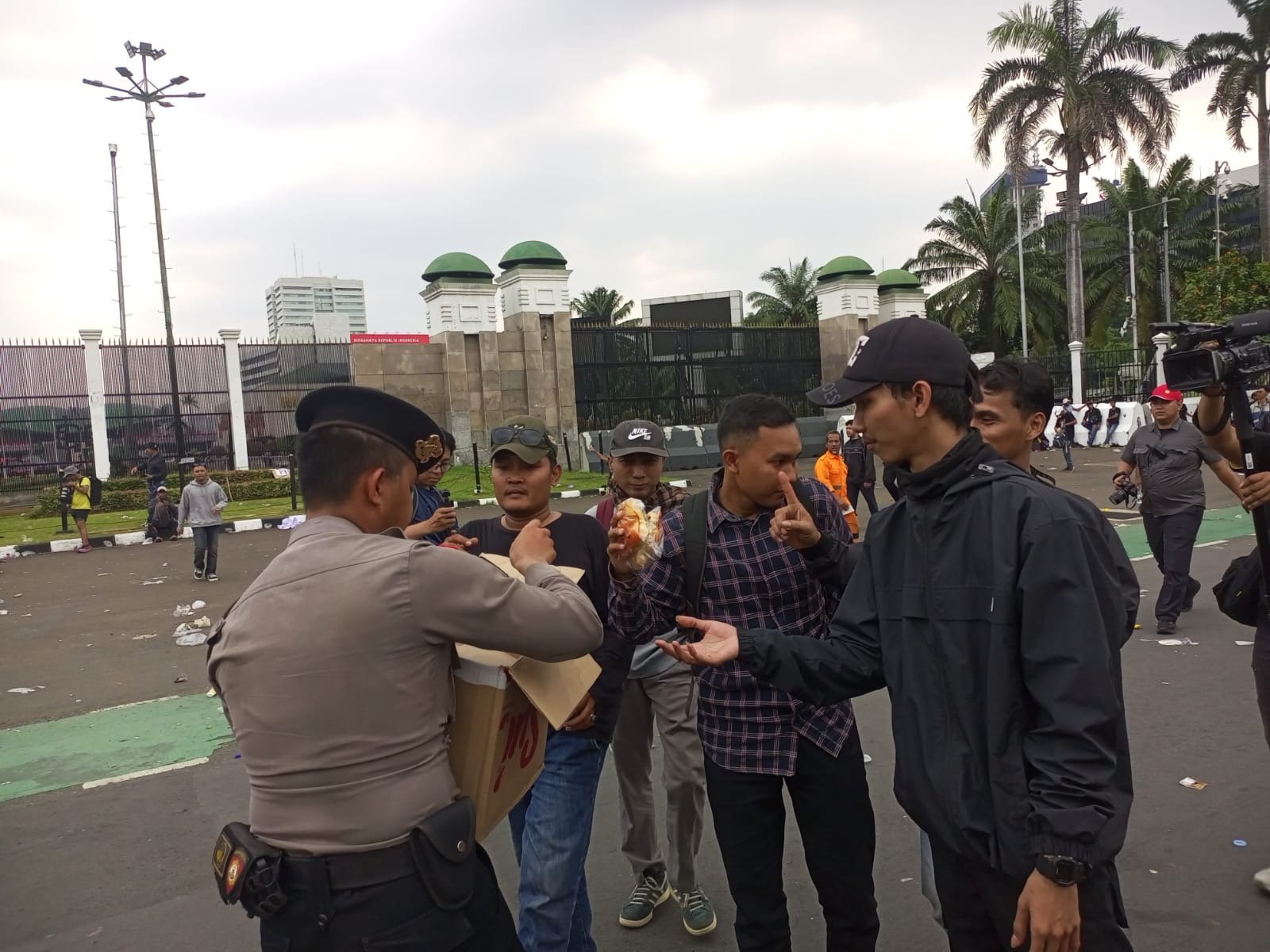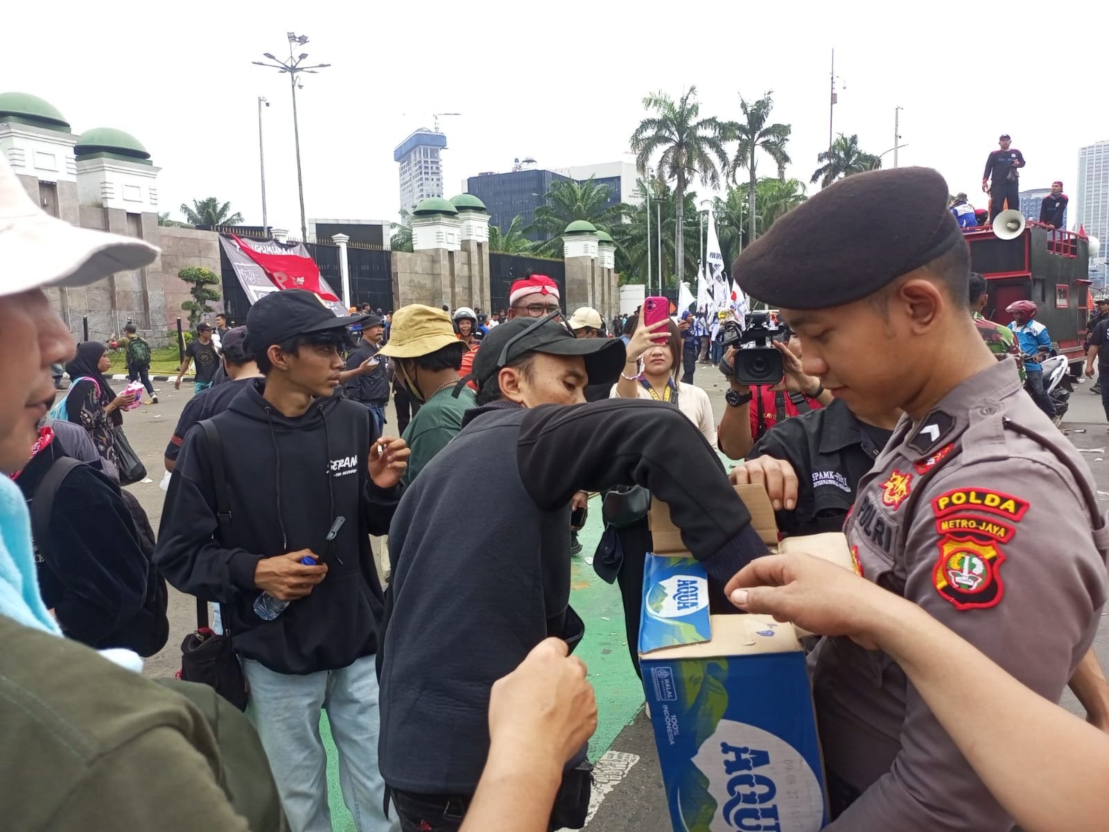 Jakarta – Di sela-sela pengamanan aksi unjuk rasa elemen buruh di depan Gedung DPR/MPR RI, Kamis (28/8/2025), personel Samapta Polda Metro Jaya melakukan aksi simpatik dengan membagikan air mineral dan roti kepada para peserta aksi.