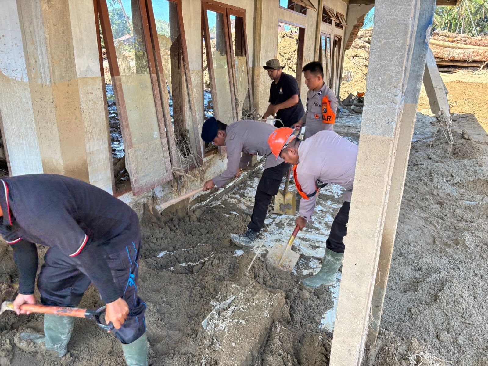 Personel Brimob turun ke lokasi-lokasi yang terendam lumpur, membantu membersihkan masjid dan rumah-rumah warga.