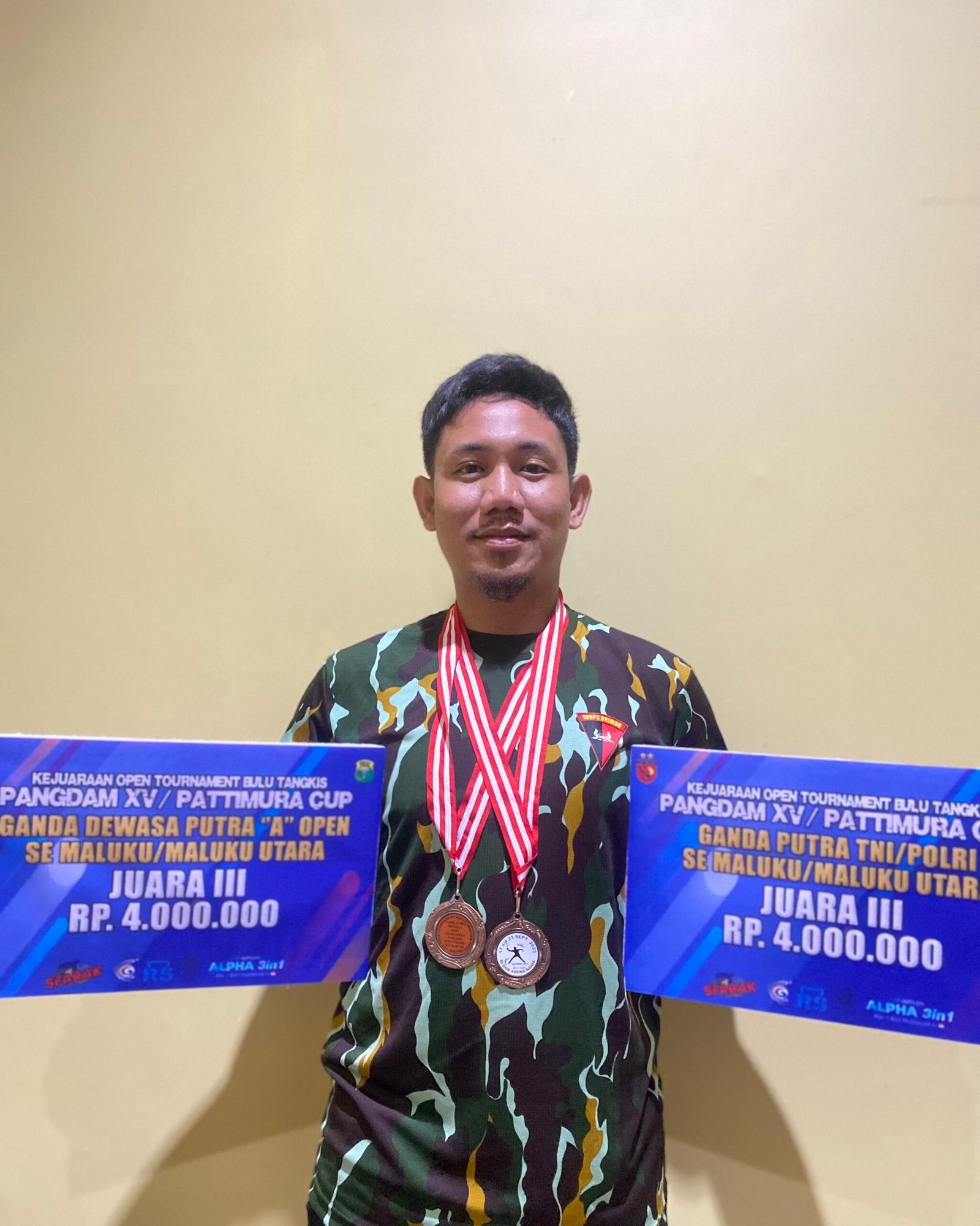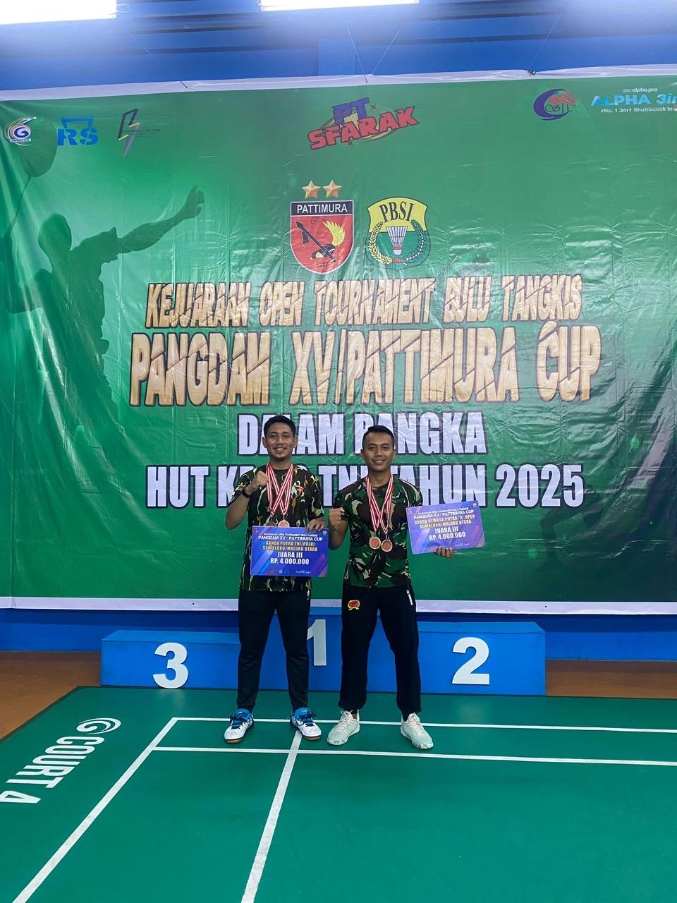 Anggota Satuan Brimob Polda Maluku Utara, Briptu Muhammad Syahputra Ahmad, berhasil meraih Juara III dalam ajang Open Tournament Bulu Tangkis Pangdam XV/Pattimura Cup yang diselenggarakan di Ambon, Provinsi Maluku, dalam rangka memperingati Hari Ulang Tahun ke-80 Tentara Nasional Indonesia (TNI) Tahun 2025, Minggu (21/9).