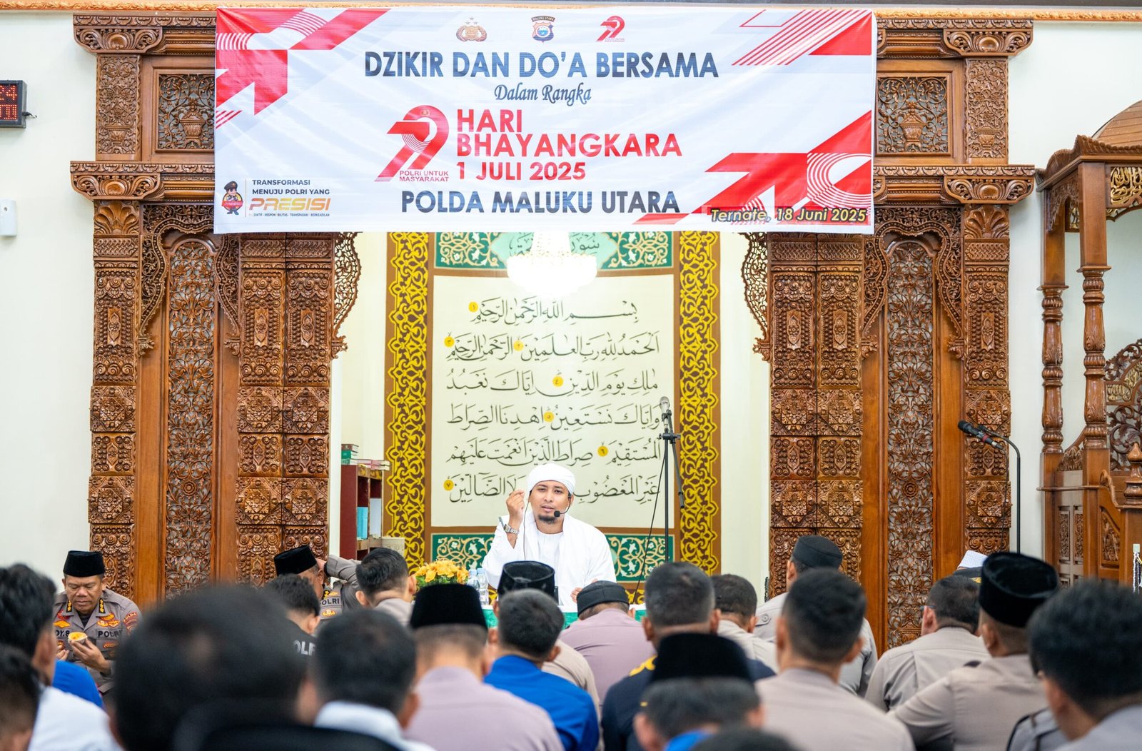 Humas Polri – Dalam rangka menyambut Hari Bhayangkara ke-79 Tahun 2025, Polda Maluku Utara menggelar kegiatan Dzikir dan Doa Bersama yang berlangsung khidmat di Masjid Nurul Huda Polda Maluku Utara, pada Rabu (18/6).