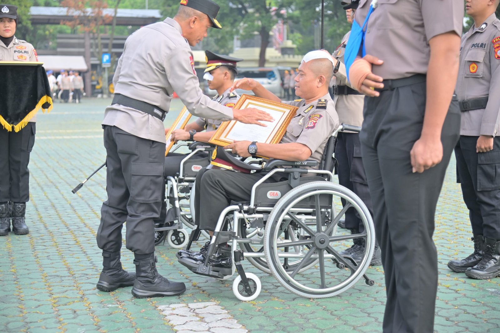 “Luka yang mereka alami bukan kelemahan, melainkan bukti nyata pengabdian. Kenaikan pangkat luar biasa ini adalah simbol penghormatan negara atas keberanian dan loyalitas yang mereka tunjukkan. Jadikan momen ini sebagai inspirasi dan teladan bagi seluruh anggota Polri untuk terus berbuat yang terbaik bagi masyarakat, bangsa, dan negara,” ujar Kapolda Jabar Irjen Pol Rudi Setiawan dalam amanatnya.