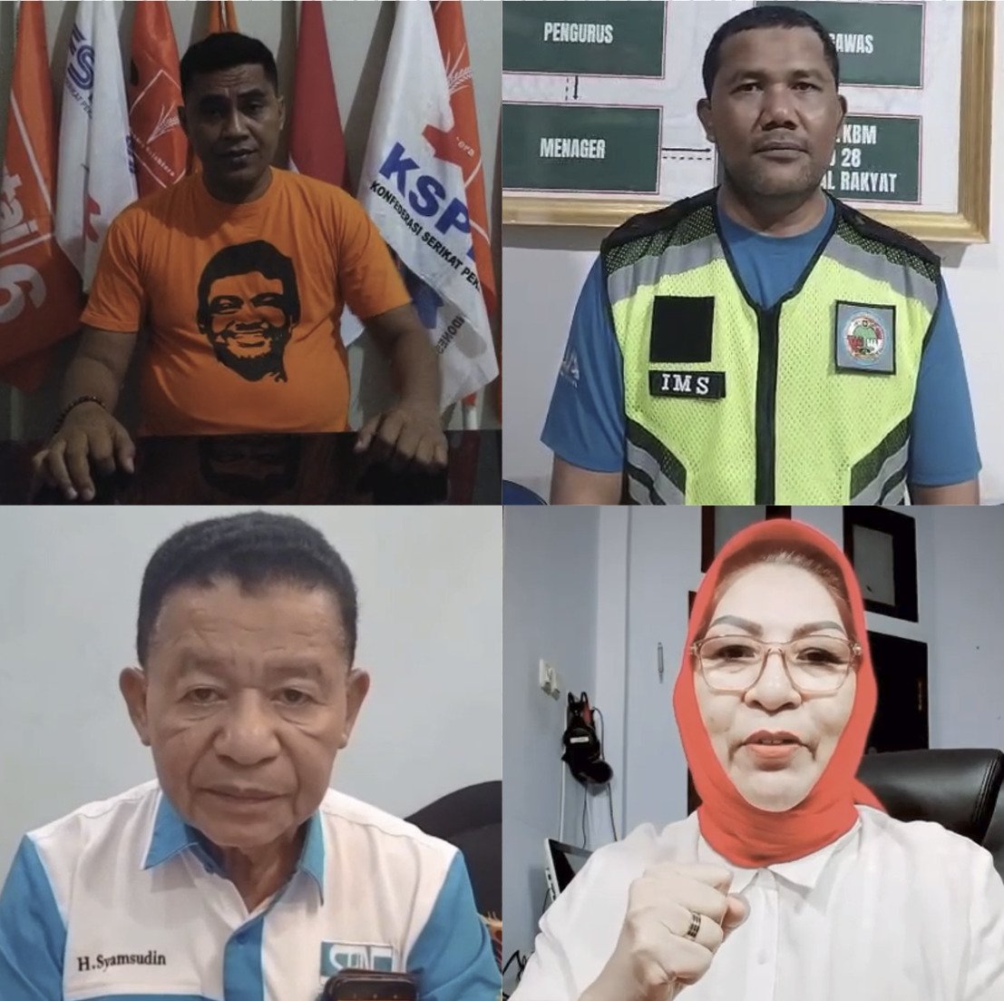 Para Aktivis buruh di Maluku Utara yang menyuarakan aksi May Day dengan kegiatan positif dan semangat solidaritas yakni Ketua Partai Buruh Yusri Muksin, Wakil Ketua Koperasi TKBM Pelabuhan Ternate Irfan M. Saleh, Ketua Serikat Buruh Garda Nusantara Arman Rajak, Ketua Dewan Pimpinan Daerah Serikat Pekerja Nasional Provinsi Maluku Utara Syamsudin dan Ketua Serikat Pekerja Seluruh Indonesia Provinsi Maluku Utara Ike Masita Tunas.