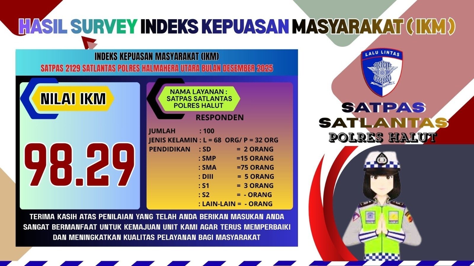 Satuan Penyelenggara Administrasi (Satpas) SIM Polres Halmahera Utara melaporkan hasil Indeks Kepuasan Masyarakat (IKM) terhadap layanan pengungkapan Surat Izin Mengemudi (SIM) untuk bulan Desember 2025. Hasil survei menunjukkan bahwa tingkat kepuasan masyarakat terhadap layanan SIM di Satpas Polres Halmahera Utara mencapai skor IKM sebesar 98,29.