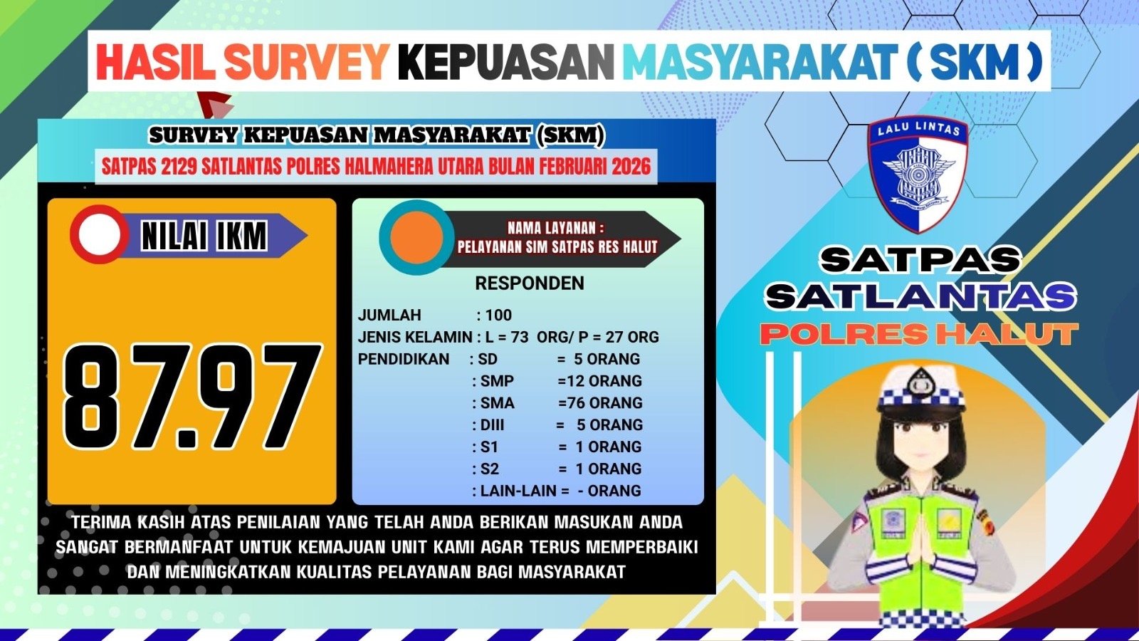 Satuan Penyelenggara Administrasi (Satpas) SIM Polres Halmahera Utara melaporkan hasil Indeks Kepuasan Masyarakat (IKM) terhadap layanan pengungkapan Surat Izin Mengemudi (SIM) untuk bulan Februari 2026. Hasil survei menunjukkan bahwa tingkat kepuasan masyarakat terhadap layanan SIM di Satpas Polres Halmahera Utara mencapai skor IKM sebesar 87,97.