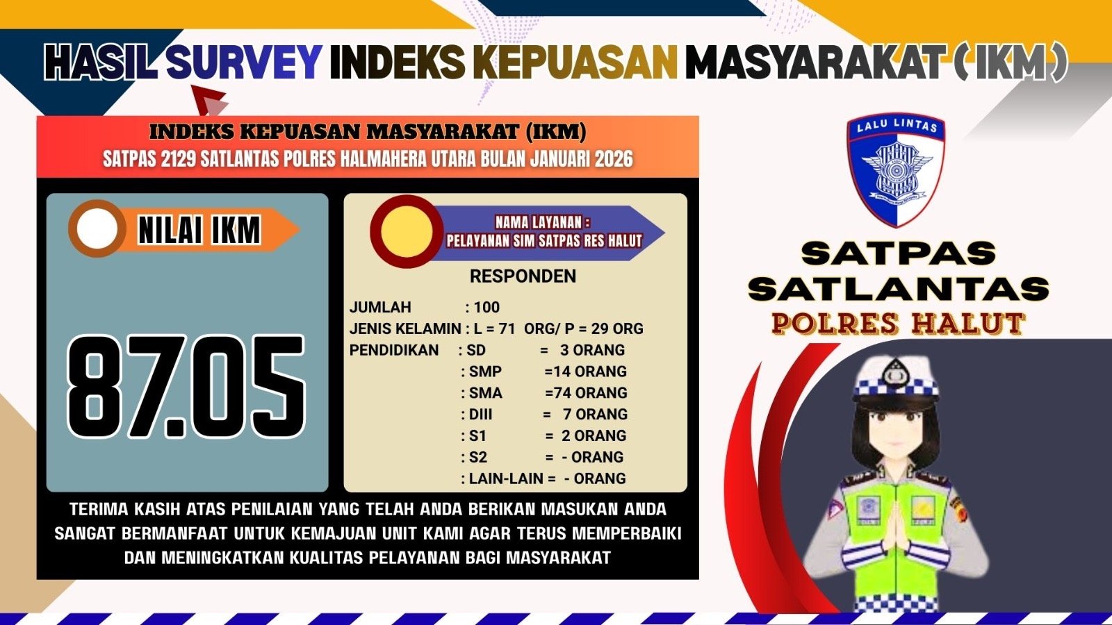 Satuan Penyelenggara Administrasi (Satpas) SIM Polres Halmahera Utara melaporkan hasil Indeks Kepuasan Masyarakat (IKM) terhadap layanan pengungkapan Surat Izin Mengemudi (SIM) untuk bulan Januari 2026. Hasil survei menunjukkan bahwa tingkat kepuasan masyarakat terhadap layanan SIM di Satpas Polres Halmahera Utara mencapai skor IKM sebesar 87,05.