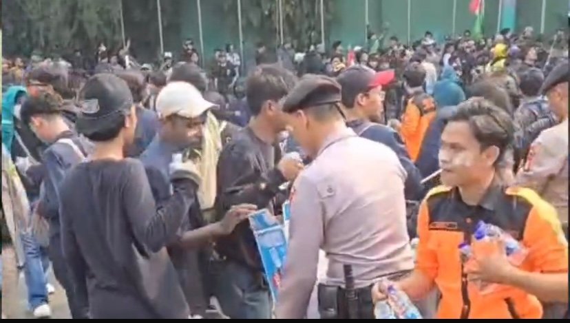 Jakarta. Sebanyak 1.250 Personel Kepolisian diterjunkan untuk mengamankan aksi Unjak Rasa di Gedung MPR/DPR RI. Dalam pengamanan ini seluruh personel ditekankan untuk berlaku humanis kepada massa aksi. Salah satu bentuk aksi humanis yang dilakukan oleh Petugas Kepolisian dengan membagikan air minum sebagai bentuk kepedulian terhadap massa aksi yang tengah menyampaikan pendapat di Jalan Gerbang Pemuda pada Senin sore(25/08/2025)