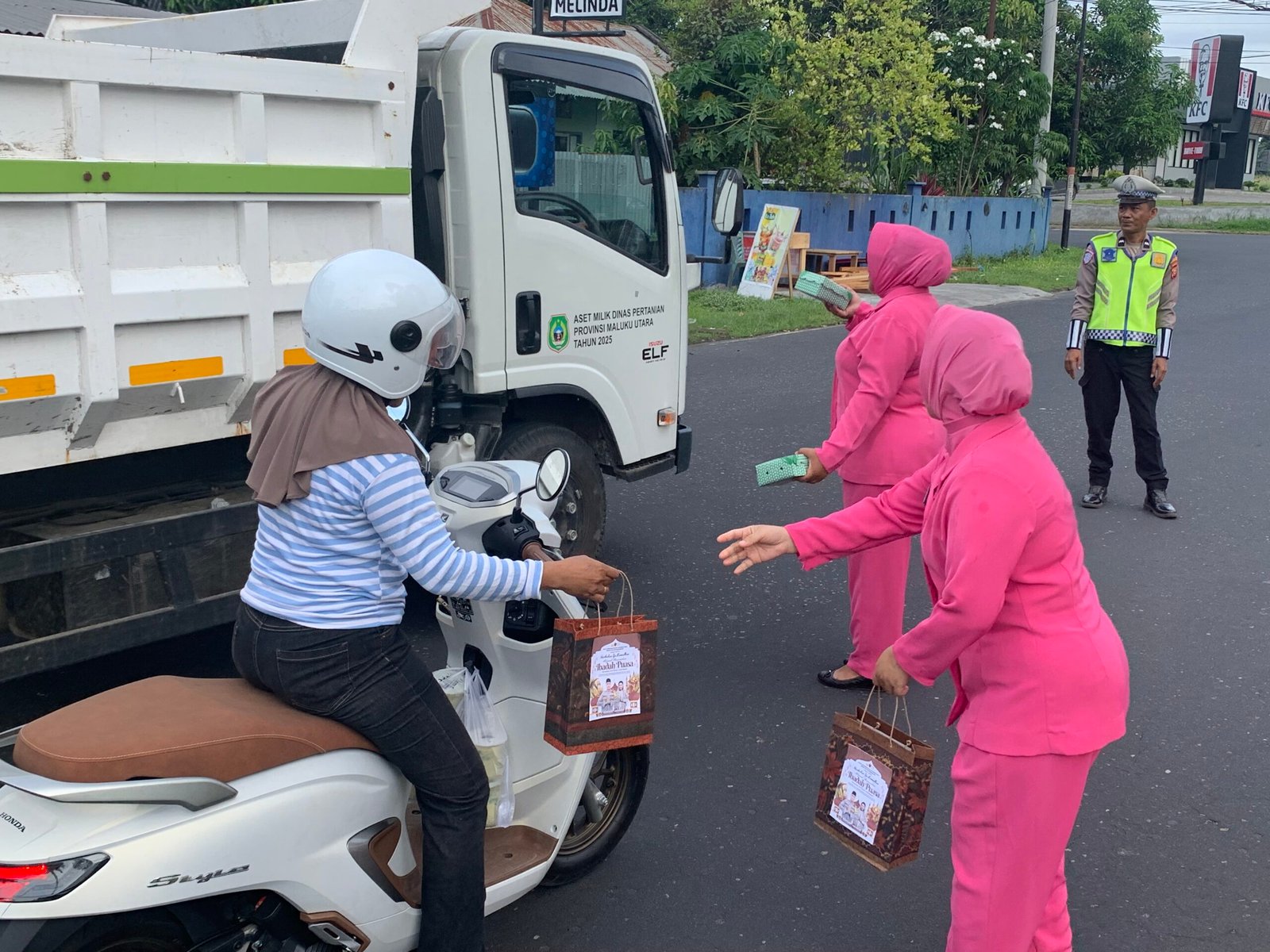 Pembagian takjil menyasar pengendara roda dua dan roda empat yang melintas menjelang waktu berbuka puasa. Sejumlah personel Satlantas Dan Bagren bersama Bhayangkari turun langsung ke jalan membagikan paket takjil secara gratis.