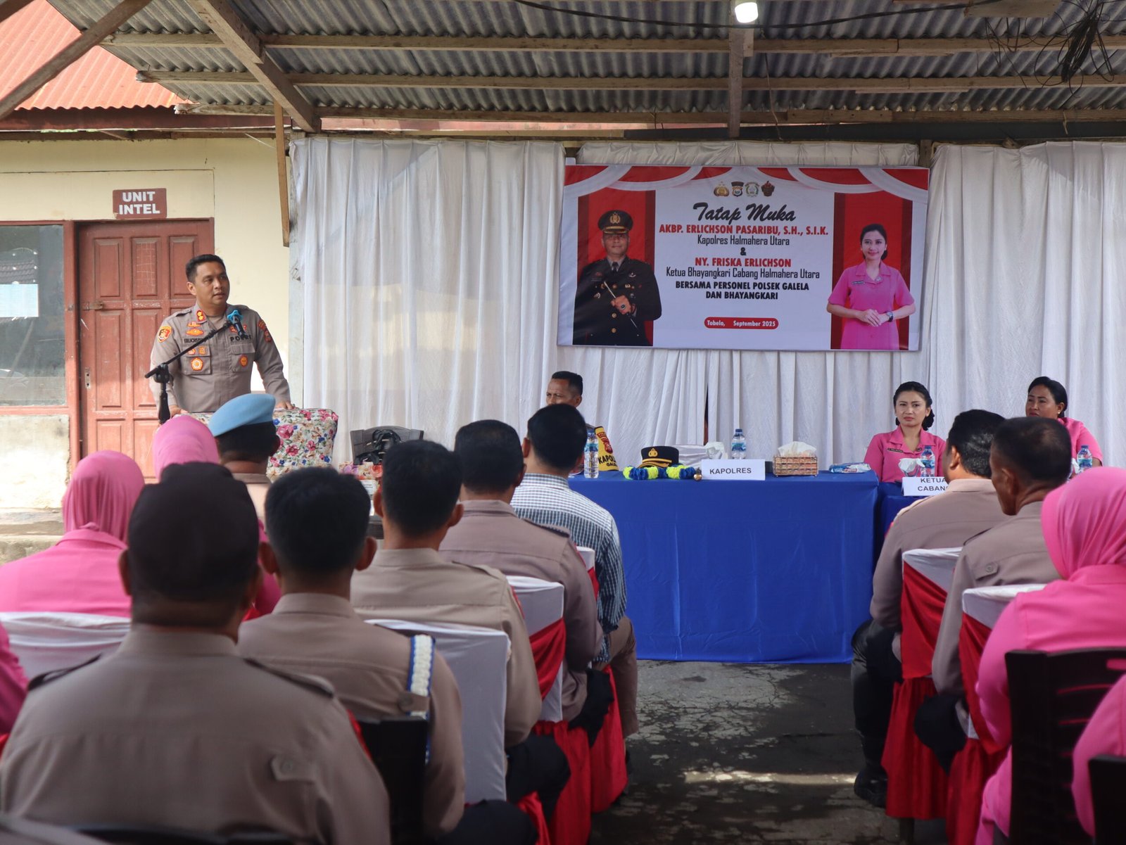 Dalam kunjungan ini, AKBP Erlichson Pasaribu, disambut langsung oleh Kapolsek IPTU Maks Manolang SE beserta seluruh personel Dan Bhayangkari Ranting Galela, Dalam Arahan Kapolres Halmahera Utara Menyampaikan Sebagai anggota Polri kita harus banyak bersyukur karena telah diberikan pekerjaan dan mendapatkan fasilitas gaji, Laksanakan tugas dengan tulus tanpa ada kepentingan pribadi, Saat ini penilaian terhadap Institusi Polri sangat rendah, untuk itu ada beberapa hal yang harus kita lakukan yakni,Tidak melakukan Pungli, Tidak Arogan, Tidak Menggunakan Kekerasan