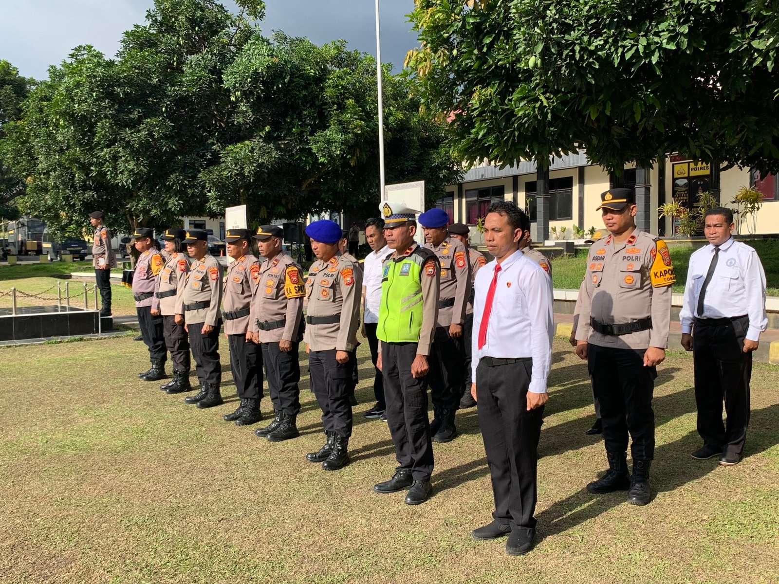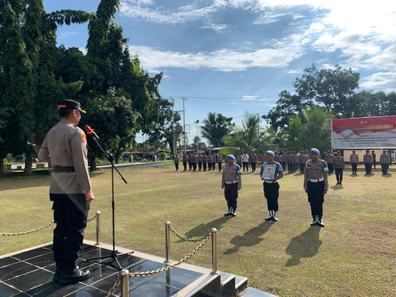 Upacara dipimpin oleh Kapolres Halut AKBP Erlichson Pasaribu, S.H., S.I.K., selaku Inspektur Upacara, dengan dihadiri para Kabag, Kasat, Kapolsek jajaran, perwira, dan personel Polres Halut.