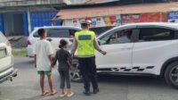 Petugas Pos Pam Operasi Lilin Sigab Bantu Menyeberangkan anak Kecil Di Tengah Kemacetan.