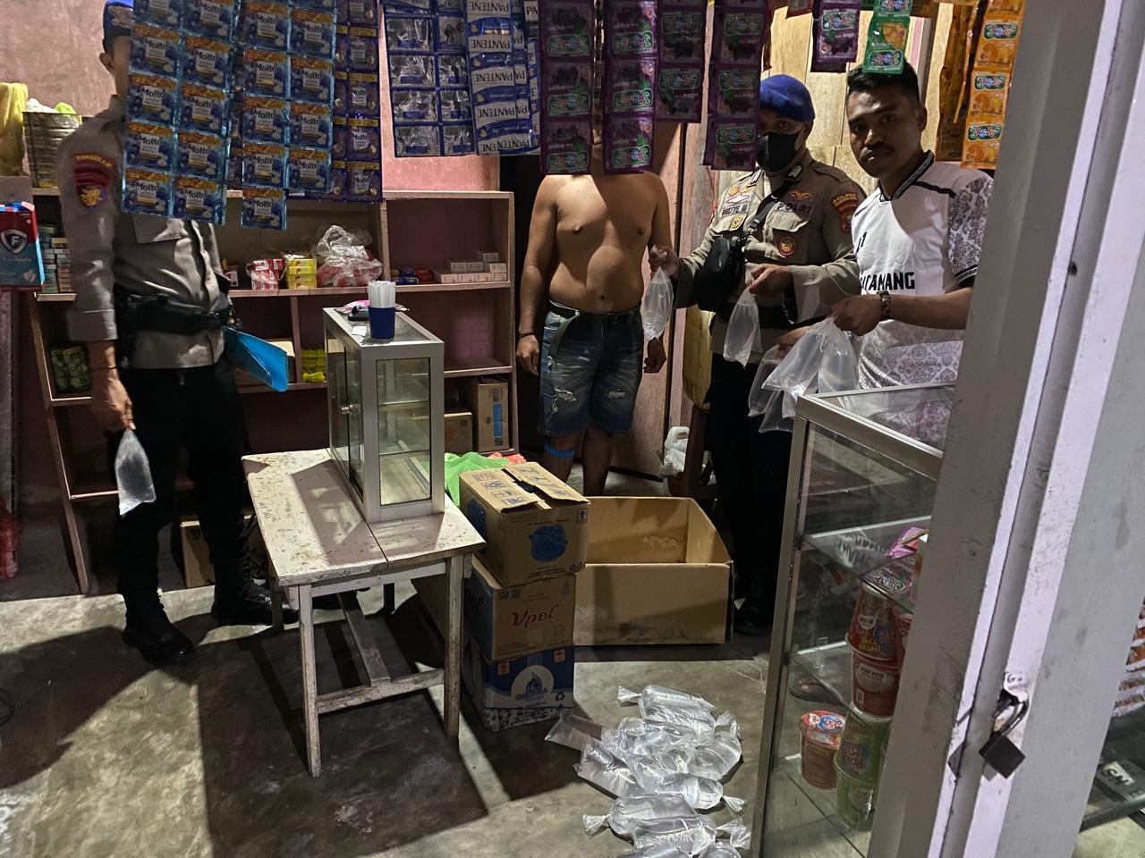 Humas Polres halut – Sat Polairud Polres Halmahera Utara Melaksanakan Razia Miras Tanpa izin yang dipimpin langsung oleh Kasat Polairud Agus Dwi Sunarto,S.H. Bersama Personil Piket Polairud Regu 3 Melaksanakan Raji Di Wilayah Hukum Polres Halut yakni razia terhadap tempat atau kios yang disinyalir menjual minuman keras, Sala Satu Kios yang berada di Tobelo.Senin 15/September 2025. pukul 19.15 Wit