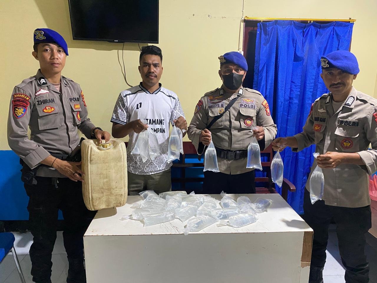 , Kasat Polairud bersama Personil Piket Polairud melaksanakan Razia Miras Tanpa Izin. di Desa WKO tepatnya di pemilik rumah A.n Glen alias En dengan barang bukti yang di dapat 28 Kantong Plastik miras jenis Cap Tikus dan barang bukti langsung di amankan oleh Personil Sat Polair Polres Halut, ke Mako Polres Halmahera Utara