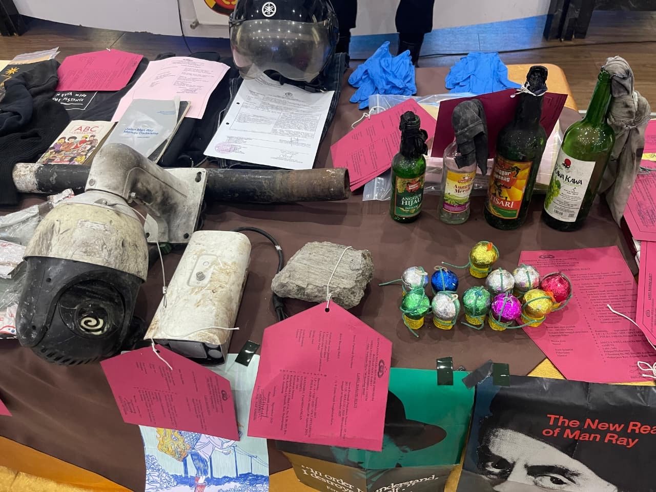 “Barang bukti yang diamankan antara lain puluhan bom molotov siap pakai, bahan peledak rakitan, ratusan buku dan artikel bermuatan ideologi anarkis, hingga perangkat elektronik yang digunakan untuk menyebarkan konten provokatif.” ujarnya.
