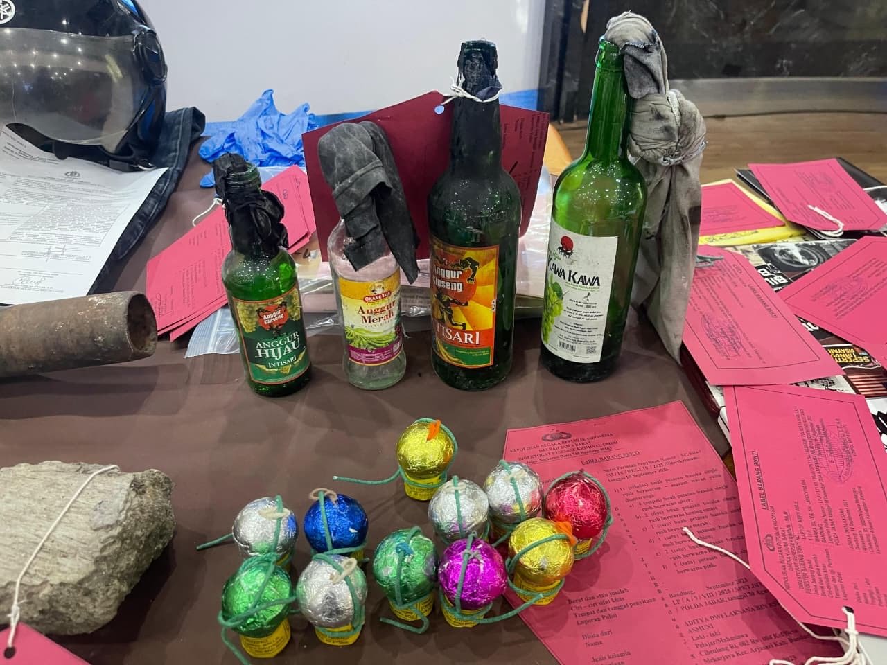 “Barang bukti yang diamankan antara lain puluhan bom molotov siap pakai, bahan peledak rakitan, ratusan buku dan artikel bermuatan ideologi anarkis, hingga perangkat elektronik yang digunakan untuk menyebarkan konten provokatif.” ujarnya.