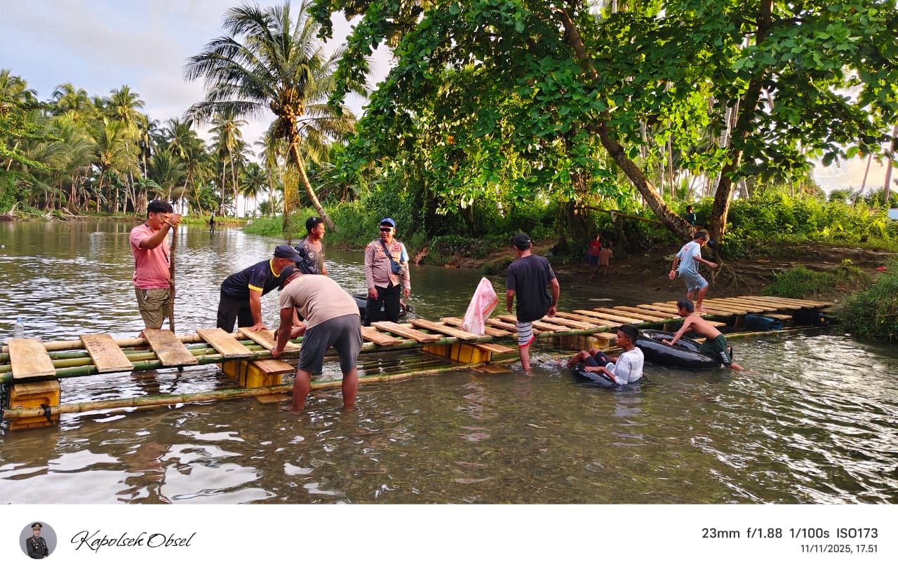 HUMAS POLDA MALUT – Personel Polsek Obi Selatan, Polres Halmahera Selatan, menggelar aksi kemanusiaan dengan membuat rakit di Sungai Gosora, Desa Bobo, Kecamatan Obi Selatan, Selasa (11/11/2025). Rakit tersebut dibuat untuk membantu warga menyeberangi sungai yang setiap hari menjadi jalur utama aktivitas masyarakat.