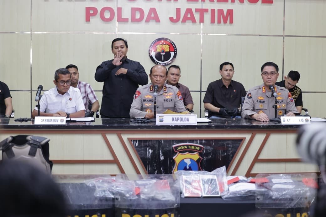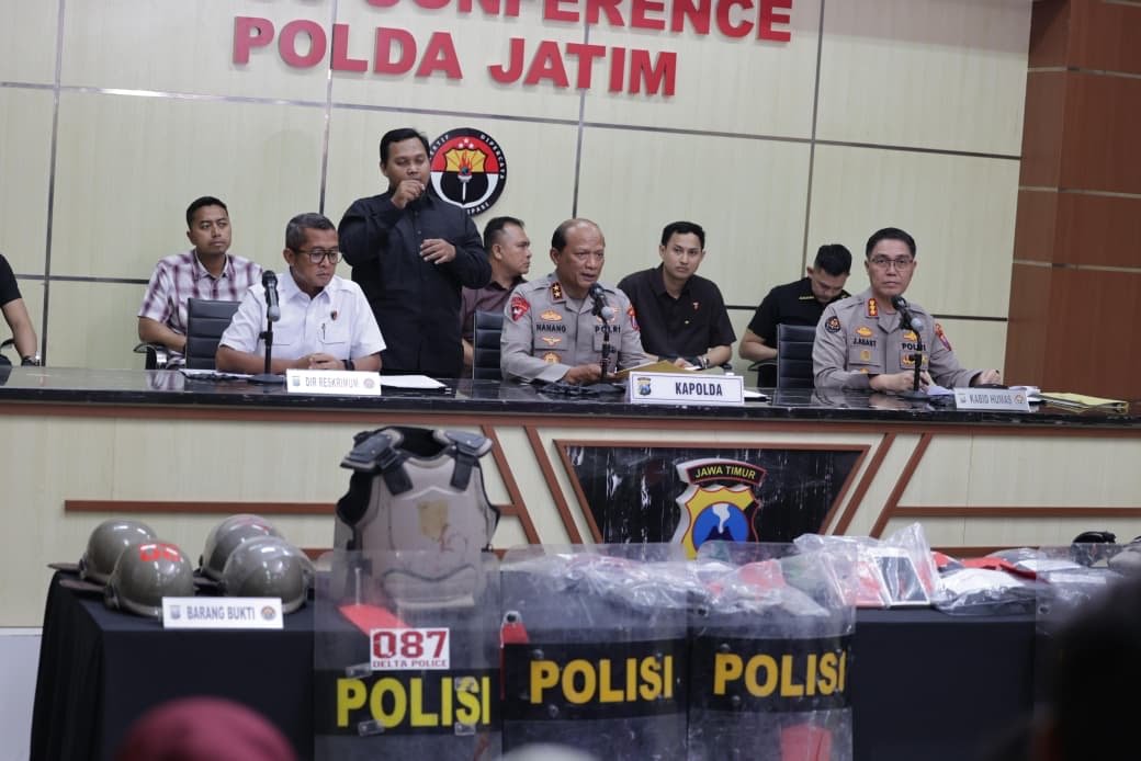 Kapolda Jatim Irjen Pol Drs. Nanang Avianto, M.Si., didampingi Kabid Humas Polda Jatim, Kombes Pol Jules Abraham Abast dan Dirreskrimum Kombes Pol Widi Atmoko, menyampaikan hasil penanganan hukum terkait aksi yang terjadi di wilayah hukum Polda Jawa Timur tersebut.