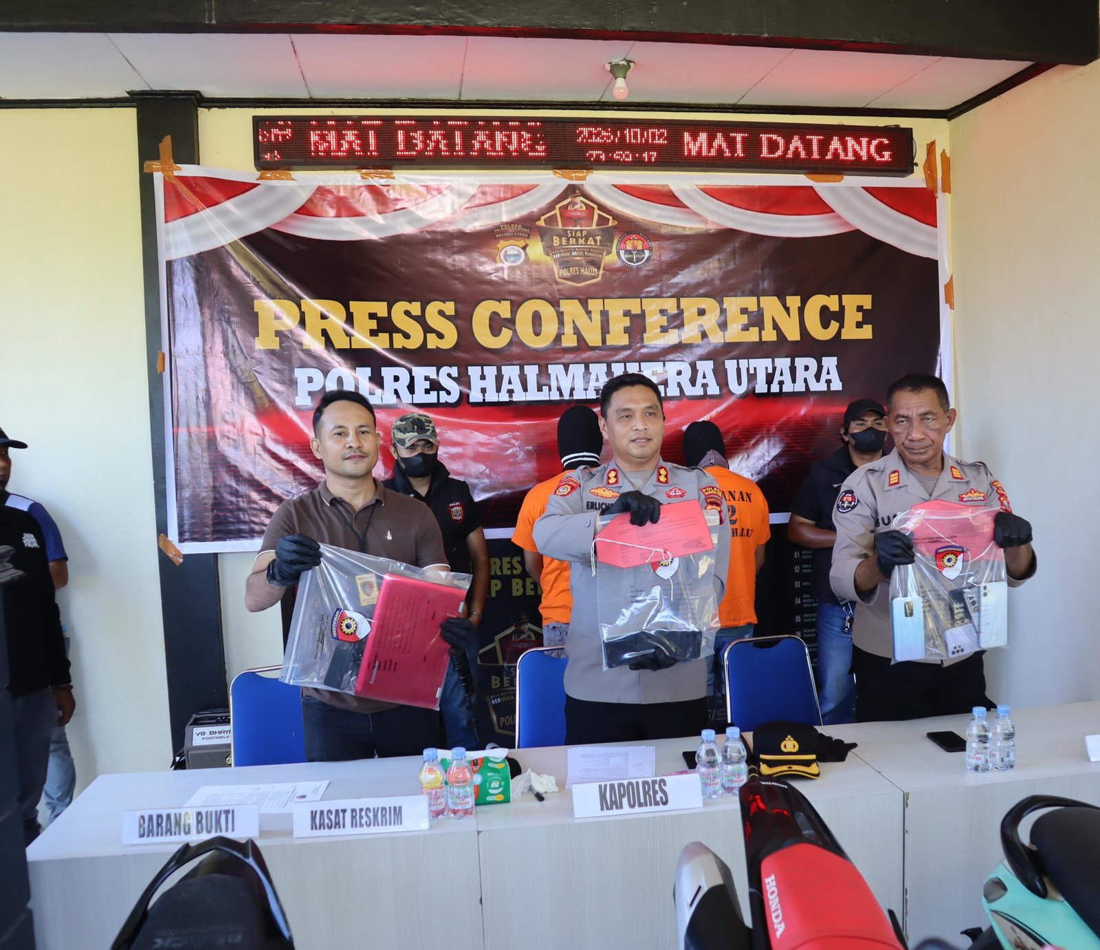 Konferensi Pers dipimpin langsung oleh Kapolres Halmahera Utara AKBP Erlichson Pasaribu, SH, SIK didampingi Kasat Reskrim Iptu Sofyan Torid, SH, dan Kasi Humas AKP Kolombus Guduru.