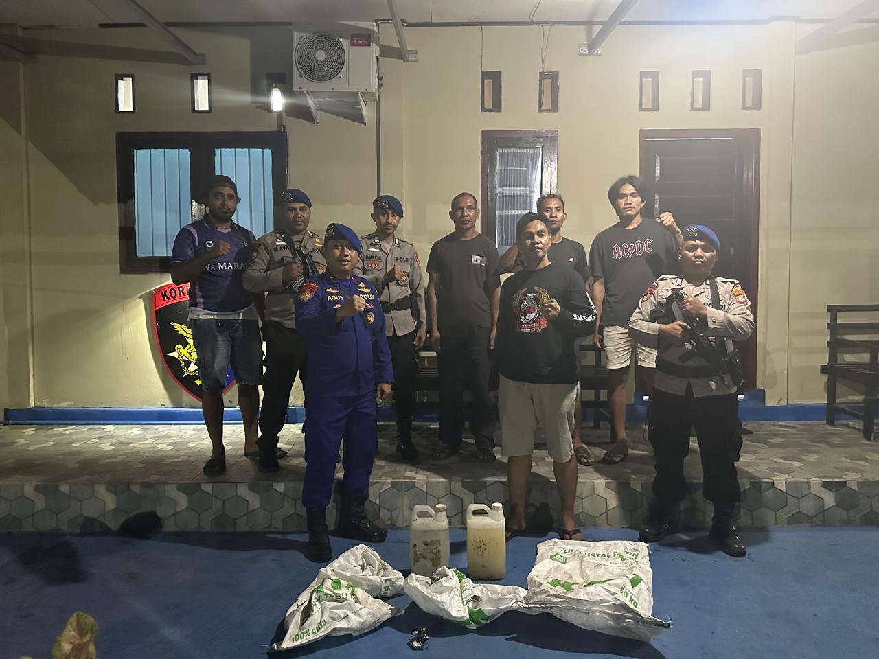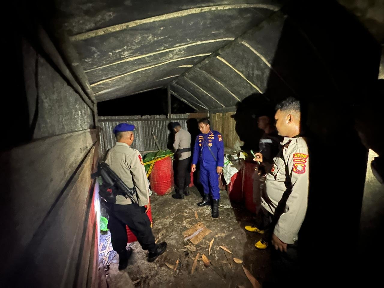 Kemudian Sekitar Pukul 19.30 wit Kasat Polairud Ipda Agus Dwi Sunarto bersama Tim Gabungan tiba di tempat punyulingan dan langsung melakukan pemeriksaan di TKP dan menemukan 9 Drom dan 2 jiregen kecil yang berisi miras aplosan yg sudah di fermentasikan oleh terduga pelaku,