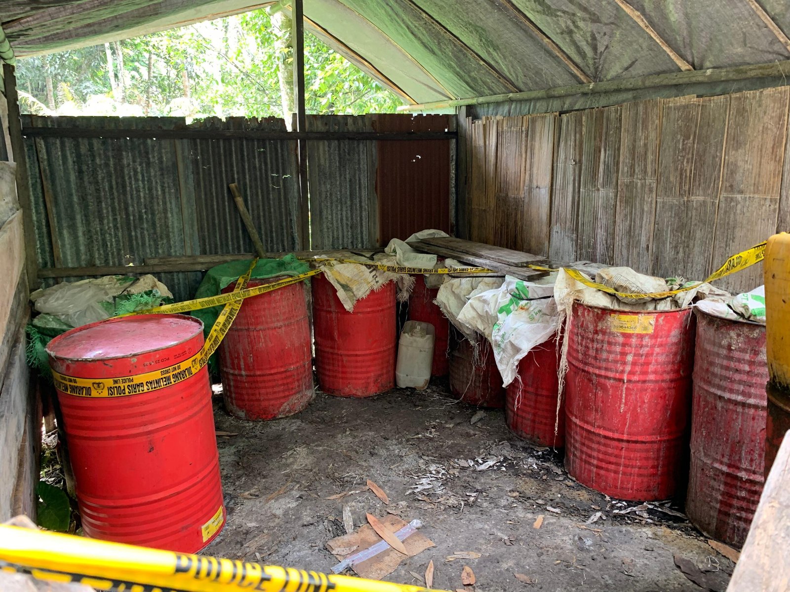 Kasat Polairud dan anggota serta personil Gabungan sat Narkoba tiba di lokasi kebun vak ( 6) Desa kali upa, tempat punyulingan dan langsung melakukan pemeriksaan di TKP dan menemukan 9 ( Sembilan ) Drom & 2 (dua) tempat penyulingan atau tempat untuk di gunakan untuk memasak miras aplosan untuk di fermetasikan oleh terduga pelaku, serta Dua unit bevak (pondok) yang digunakan untuk aktivitas produksi.
