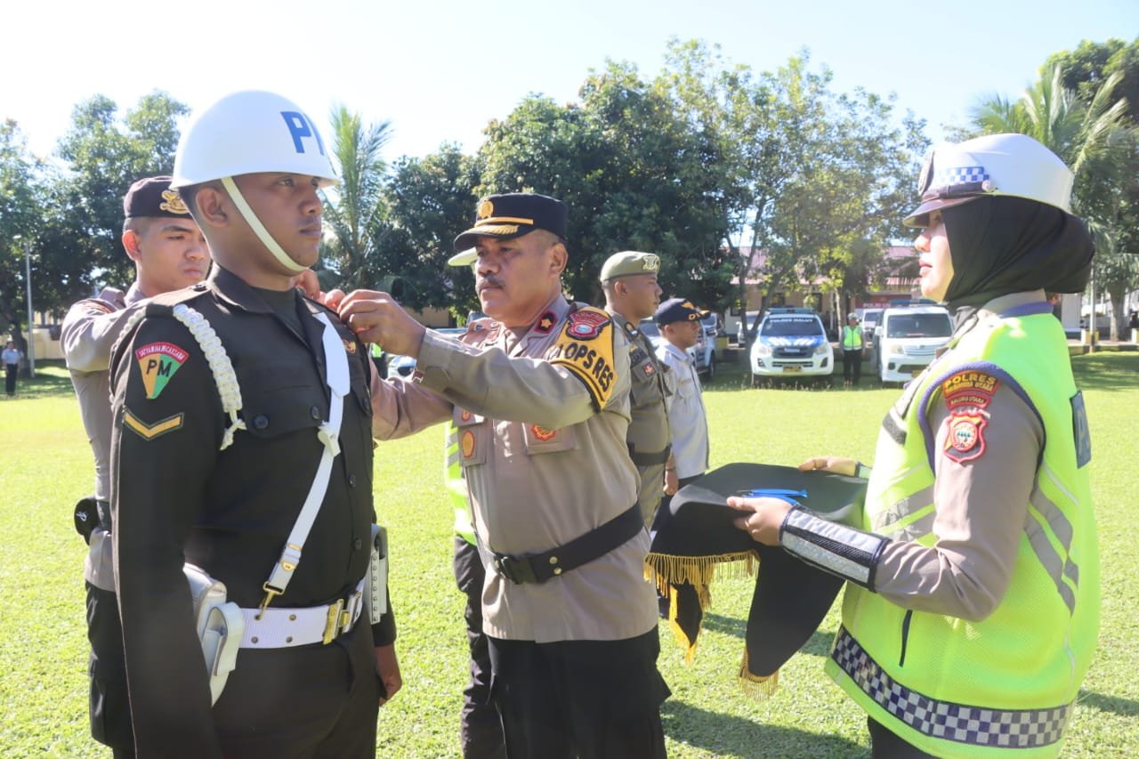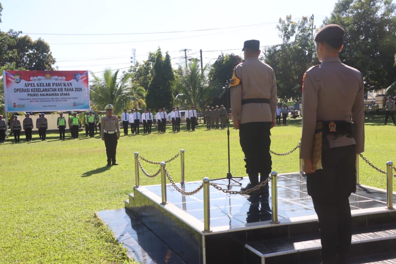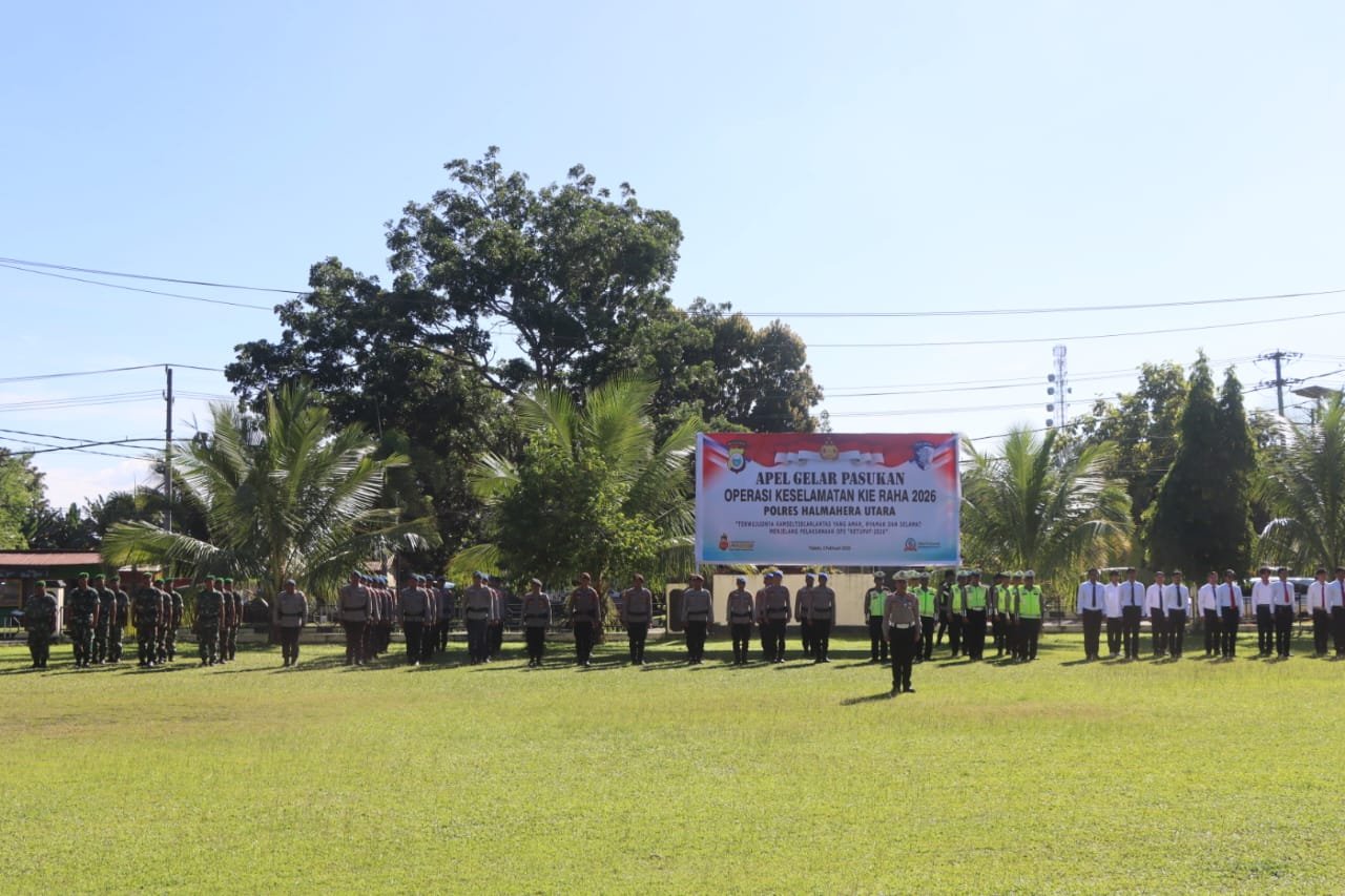 HUMAS POLRES HALUT — Polres Halmahera Utara melaksanakan Apel Gelar Pasukan Operasi Keselamatan Kie Raha 2026 sebagai bentuk kesiapan personel serta sarana dan prasarana dalam rangka menciptakan keamanan, keselamatan, ketertiban, dan kelancaran lalu lintas (Kamseltibcarlantas), Senin (02/26).