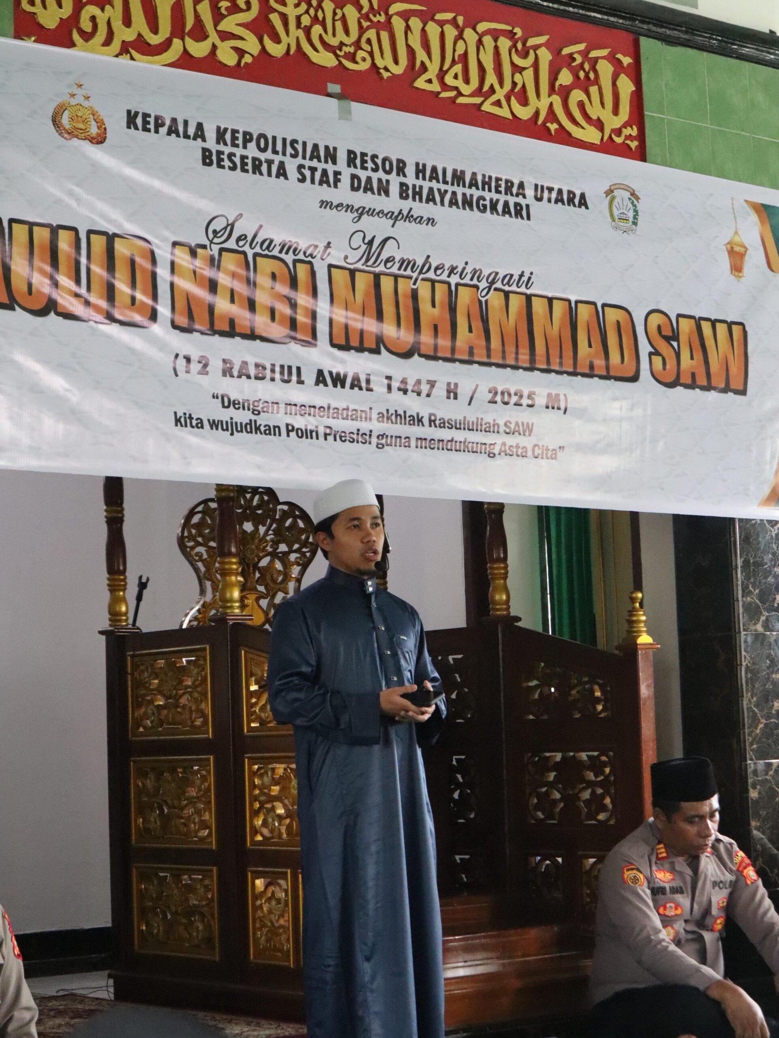 Kapolres Halut AKBP Erlichson Pasaribu., S.H., S.I.K,, Pada kesempatan ini, saya ingin menyampaikan rasa syukur dan terima kasih kepada seluruh pihak yang telah, berkontribusi dalam terselenggaranya acara ini. Semoga acara ini dapat memperkuat kecintaan kita kepada Rasulullah SAW dan meningkatkan semangat kita dalam meneladani akhlak beliau, Hari ini kita berkumpul dalam kebahagiaan dan keberkahan untuk merayakan Maulid Nabi. Mari kita merefleksikan ajaran luar biasa yang dibawa oleh Nabi kita yang mulia dan berusaha mengikuti jejaknya di kehidupan sehari-hari.