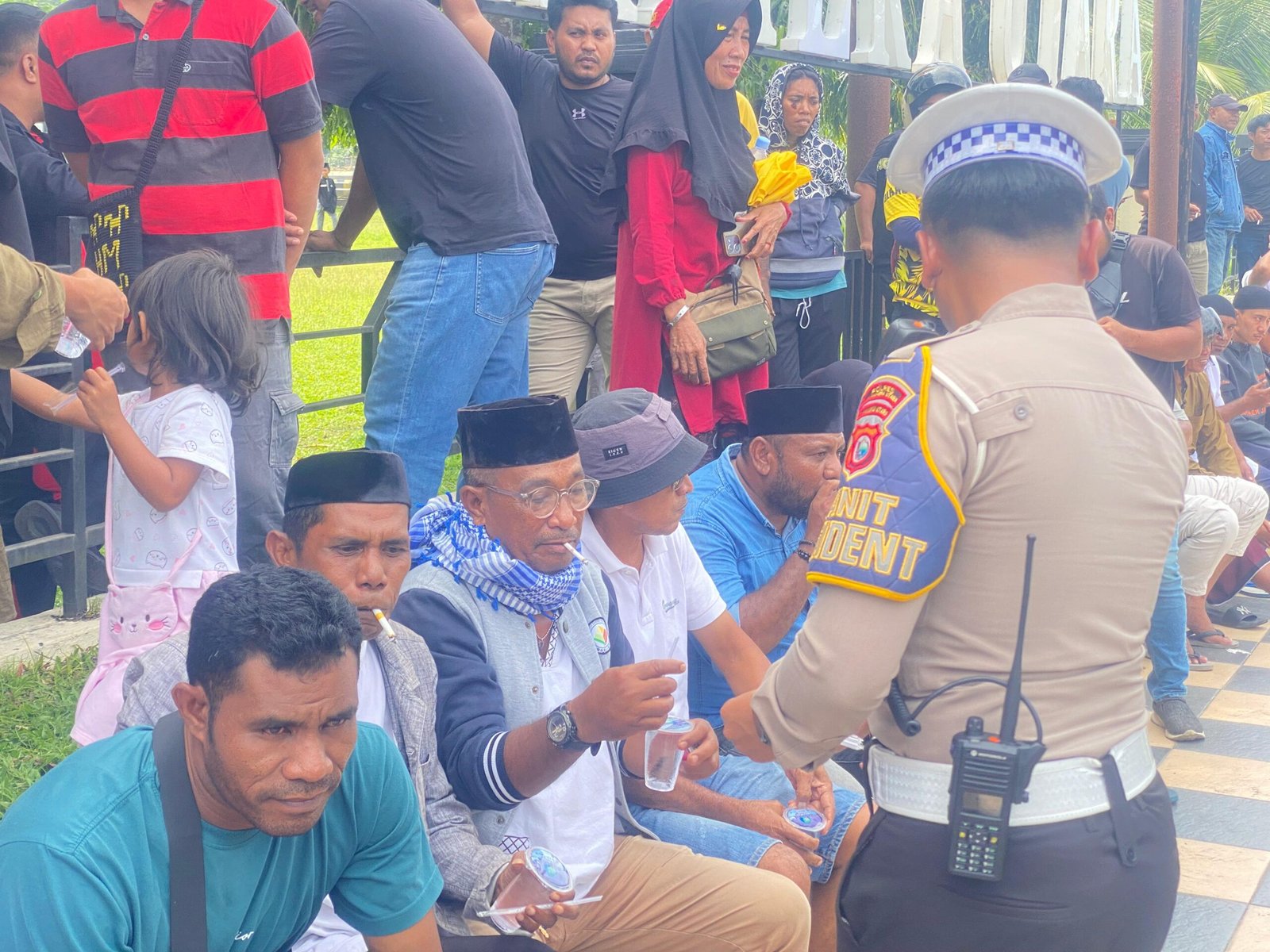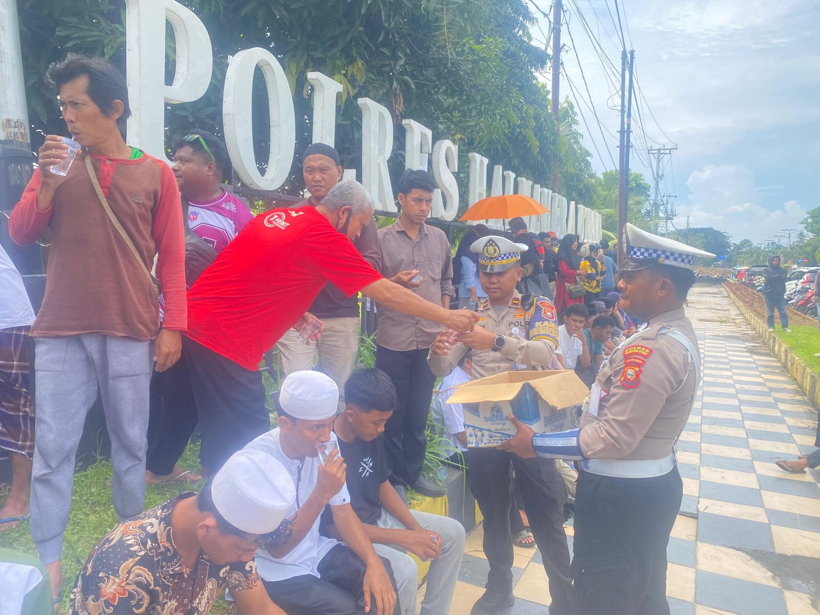 Humas Polres Halut – Di tengah aksi Damai Dari Aliansi Umat’ Islam Di Halmahera Utara di Jalan Pemerintah Desa Gamsungi Kecamatan Tobelo Kabupaten Halmahera Utara Polres Halut, Jum’at (19/9/2025), muncul pemandangan yang menyejukkan. Sejumlah polisi Dari Satuan Lalu Lintas (Satlantas) Yang Dipimpin Oleh Kanit Regident Ipda Ricky R. Indo Ratu, S.Tr. K., MH, CPHR.,CBA. terlihat membagikan air mineral kepada massa Aksi Damai di Depan Polres Halut.