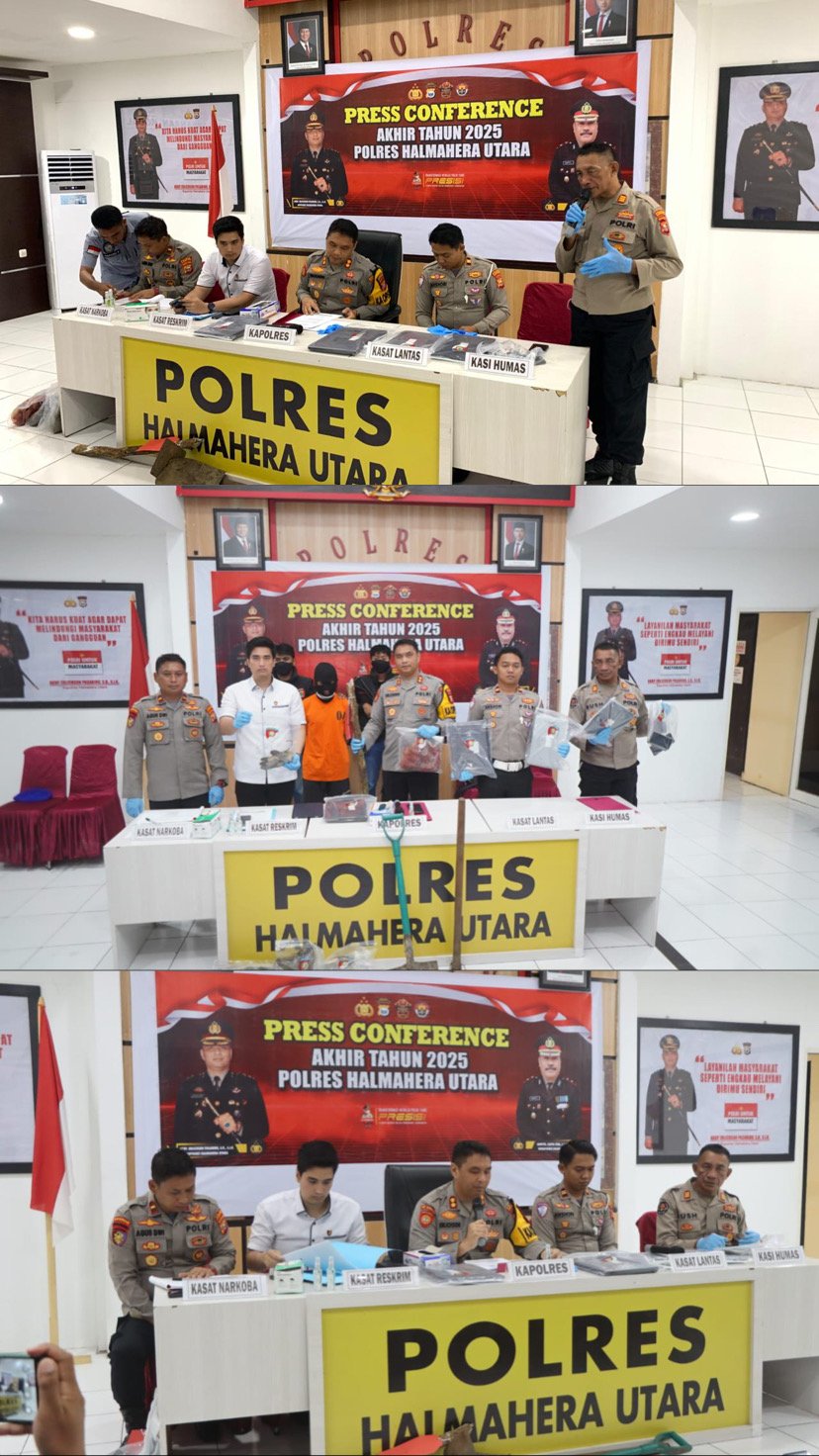 HUMAS POLRES HALUT – Untuk Menutup kalender tahun 2025, Kepolisian Resor Halmahera Utara menggelar Press Conference akhir tahun sebagai wujud transparansi dan akuntabilitas kinerja kepada Masyarakat. Kegiatan tersebut berlangsung di Ruang Vicon Polres Halmahera Utara, Maluku Utara, ( 30/12/25)