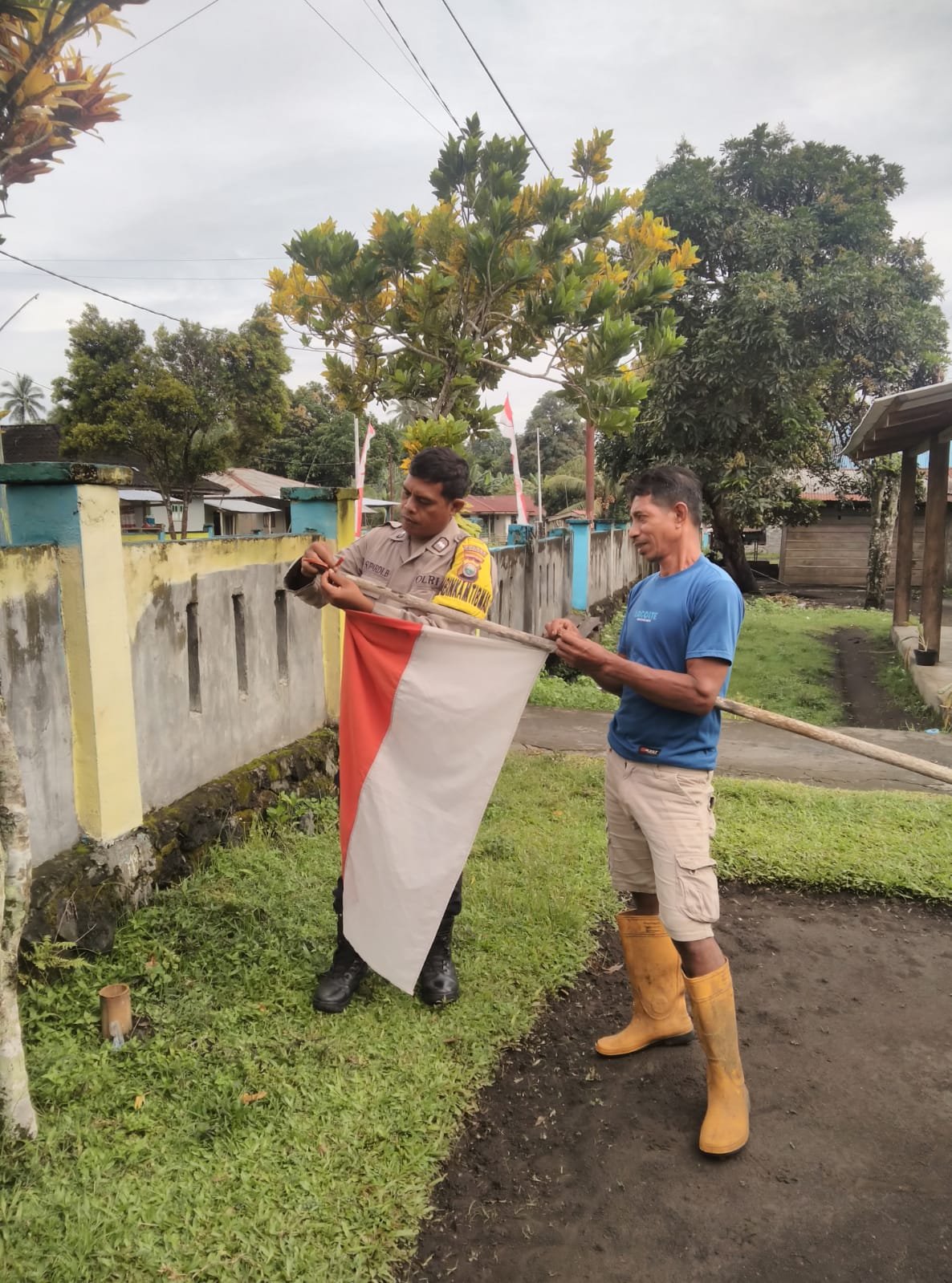 Dalam rangka menyambut HUT ke-80 RI tahun 2025, kami mengajak Warga Masyarakat serta para Ketua RW dan Ketua RT agar menghimbau warganya masing-masing untuk memasang bendera merah putih selama satu bulan penuh,” ujar AIPDA SUPARDI BALASTENG